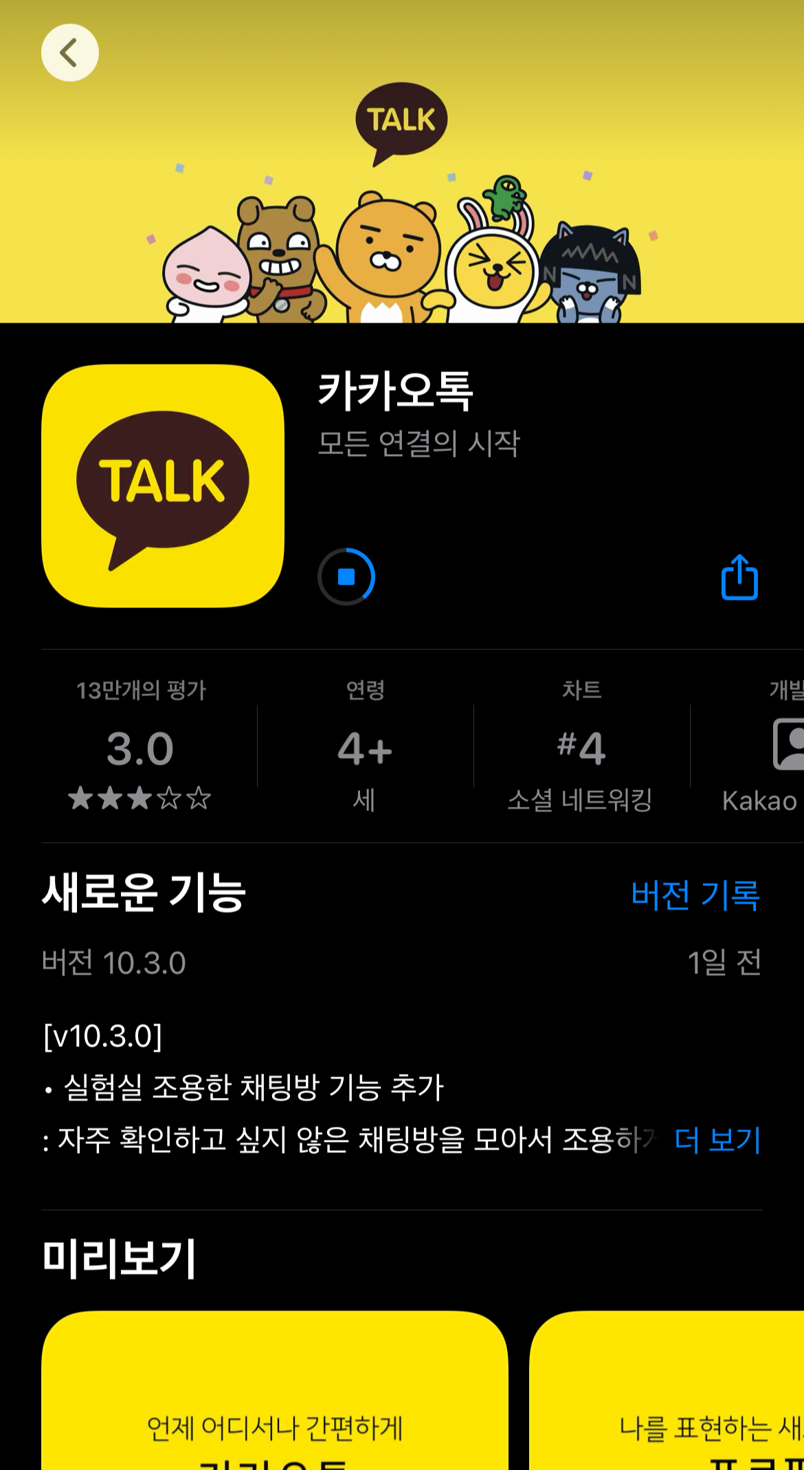 1) 카카오톡 조용한 채팅방을 사용하려면 먼저 카카오톡 업데이트를 해줘야 한다. 버전은 10.3.0 이다.