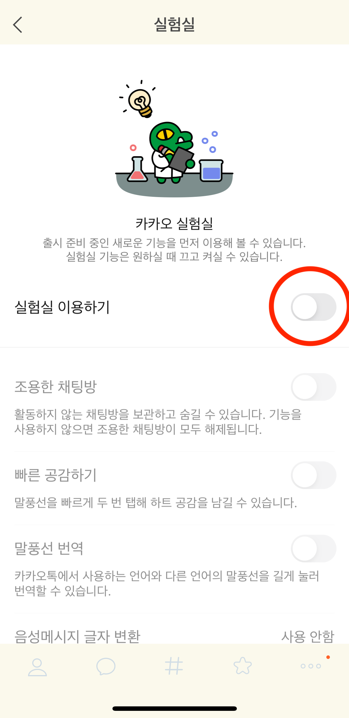 4) 실험실이 활성화되면서 조용한 채팅방이 자동으로 활성화 된다.