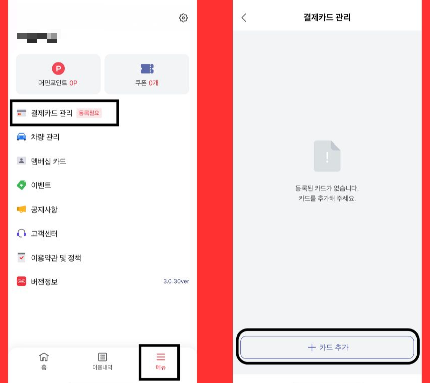 오른쪽 하단의 메뉴버튼 클릭 -> 결제카드 관리 클릭 -> 카드 추가 버튼 클릭하면