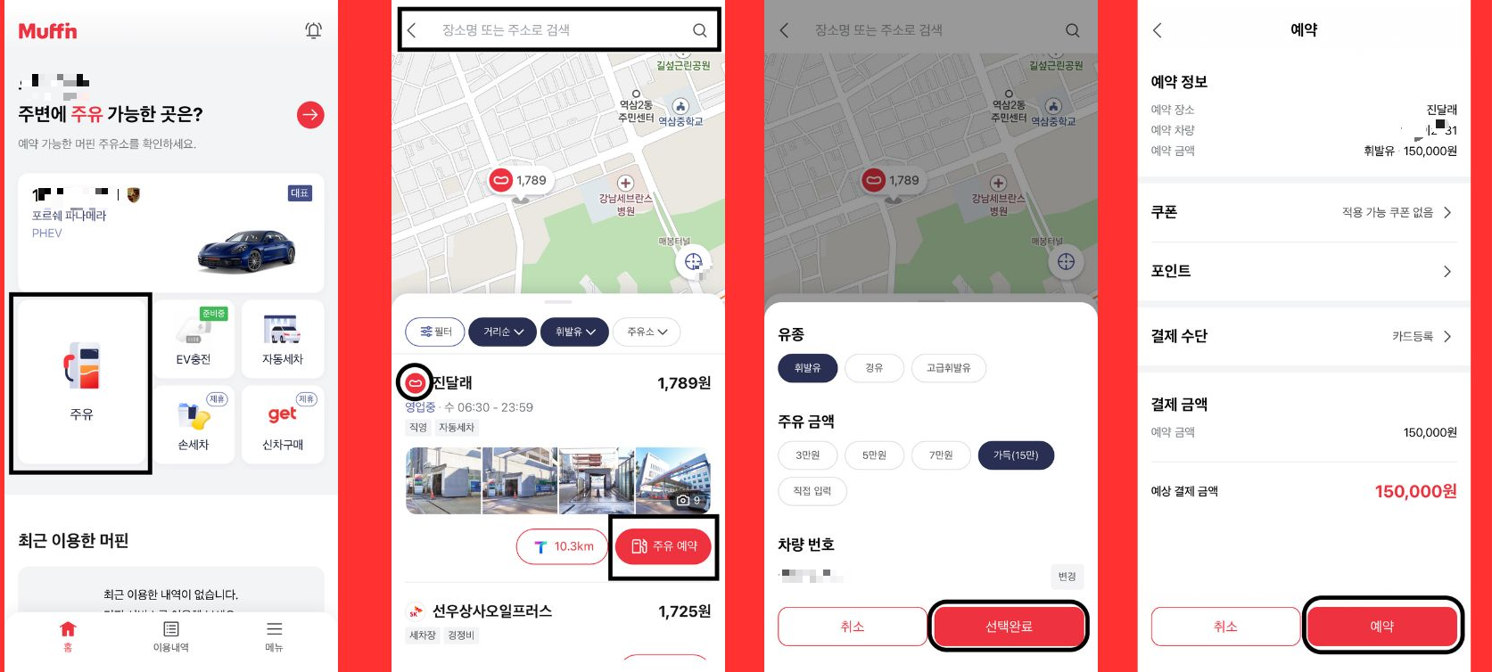 홈화면 -> 주유버튼 클릭 -> 방문할 주유소 또는 지역명 검색 -> muffin 로고가 있는 곳은 주유예약이 가능합니다.